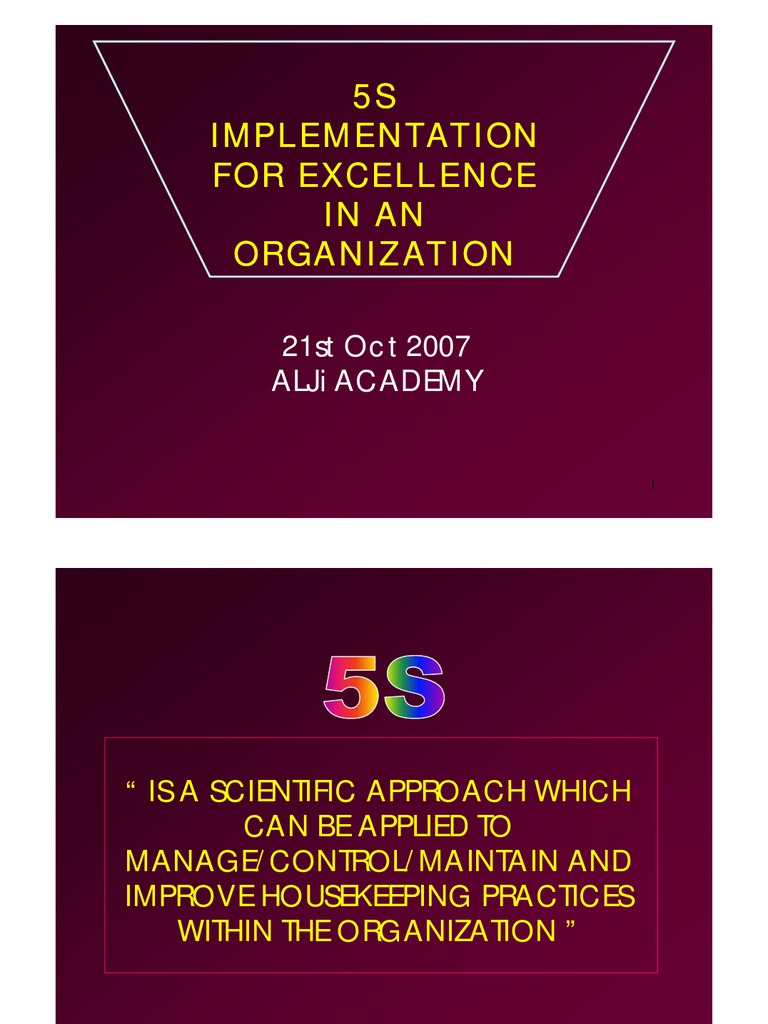 Please try again later. Toyotas adoption of the hirano approach was 4s with seiton and seiso combined. 5s is the foundation of all improvements and is the key component of establishing a visual workplace.